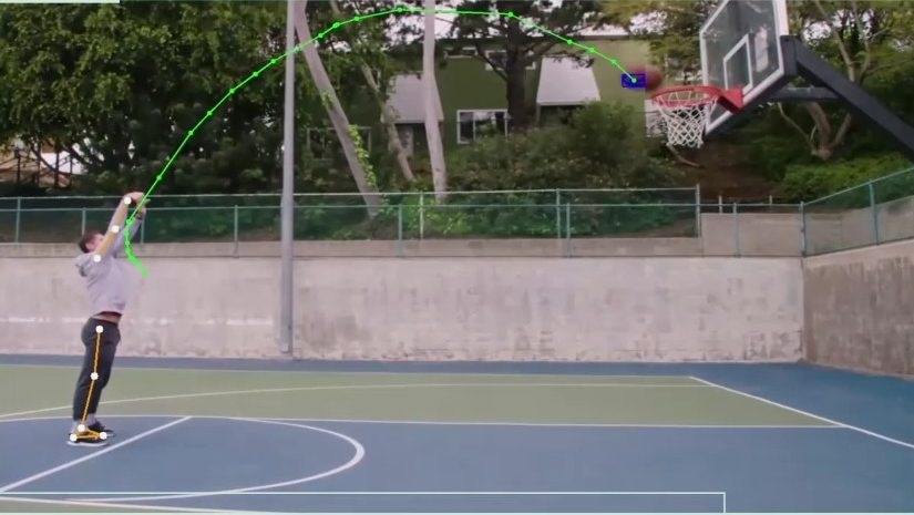 Nuestro software también es capaz de analizar tiros a canasta de baloncesto, analizando tanto la dirección del tiro como el movimiento del jugador. A continuación podrás ver una imagen de cómo lo analiza, es capaz de combinar el ball tracking con análisis de movimientos.